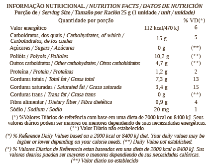 Ingredients: Cocoa nibs*, vegetable fat, roasted hazelnut, cassava starch, cocoa butter*, rice flour, cocoa powder, pea protein, soybean oil, bamboo fiber, salt, maltitol natural sweetener, polydextrose and guar gum stabilizer, soy lecithin emulsifier, baking soda and flavoring. CONTAINS GLUTEN. ALLERGY INFORMATION: CONTAINS HAZELNUT AND SOY DERIVATIVES. MAY CONTAIN PEANUTS, ALMONDS, CASHEW NUTS, BRAZIL NUTS AND WHEAT. *Rainforest Alliance Certified. Learn more at www.ra.org